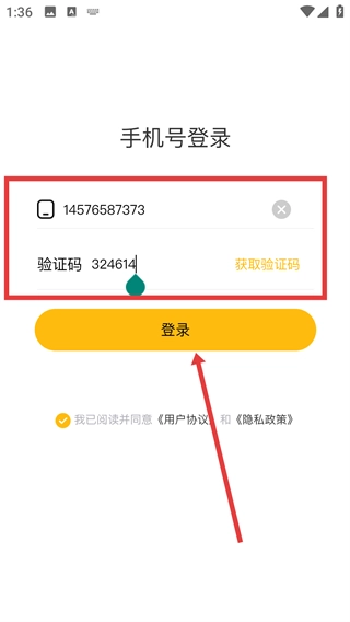 2、在手机号登录界面,填写已输入的手机号,获取并填入验证码,勾选协议同意项后点击“登录”按钮,完成账号登录操作。
