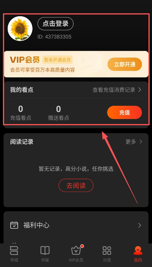 1、首先在首页底部导航栏,点击我的完成账号登录后,就能同步个人阅读数据了,记得去福利中心看看有无新手礼包哦。