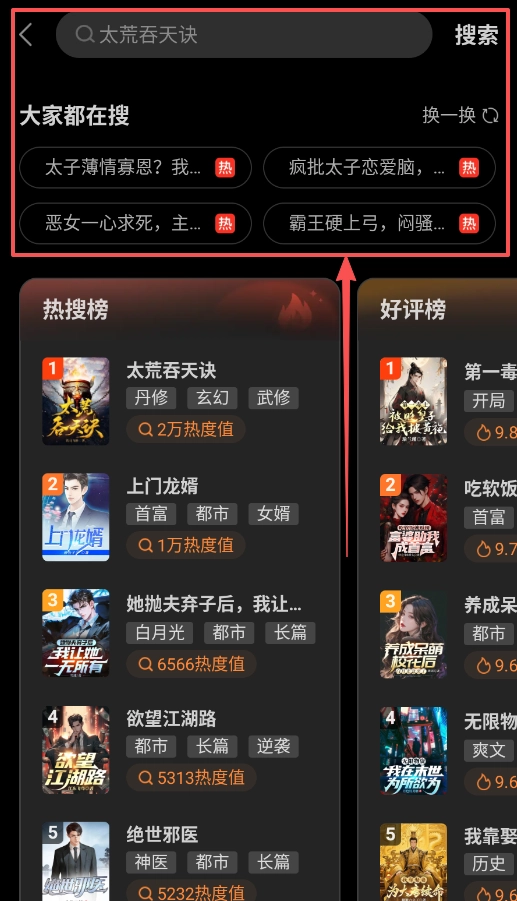 3、想追热门作品的话,多关注搜索页的大家都在搜和热搜榜,或者去书城口碑榜、畅销榜看看。