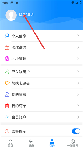 2、在个人页面中,可找到【个人信息】-【修改密码】等功能选项,点击顶部【登录/注册】按钮,进入登录相关界面。