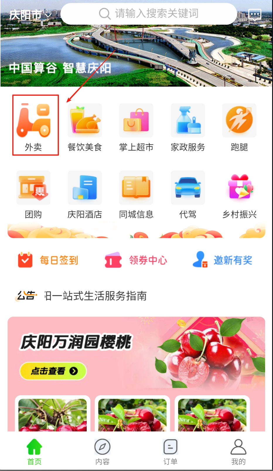 1、打开首页后选择外卖服务,查看周边商家的各类美食,完成下单操作后静候配送即可。