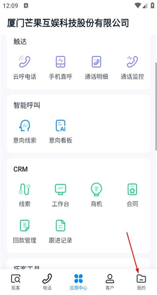 1、打开探迹后,进入应用中心页,看到触达等功能板块,点击我的选项,进入个人功能页面。
