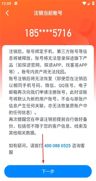 4、进入注销页面,查看账号注销说明后,点击下一步按钮,推进账号注销的流程。