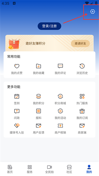 2、进入【我的】页面后,点击右上角的设置图标,进入应用的设置界面,可开展各类功能的配置操作。