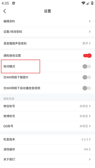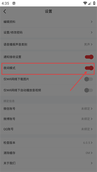 4、点击【夜间模式】的开关按钮,将其切换为开启状态,应用界面会同步切换至夜间显示模式。