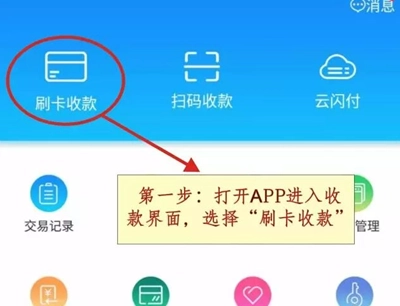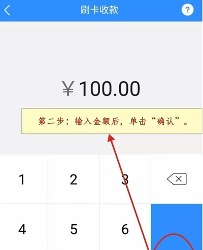 ①.在【收款】模块里找到并点击【消费】选项,进入对应页面后填写刷卡金额,接着点击确认交易按钮,这时手机屏幕上会弹出“请刷卡/插卡”的提示;