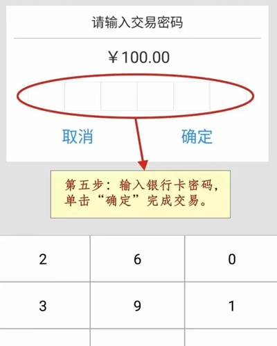 ②. 与之相连的POS机也会显示消费交易金额,等持卡人确认金额无误后,将银行卡从POS机右侧插入(芯片面正面朝里),短暂读卡后,POS机屏幕会显示该银行卡卡号,此时在POS机上按下确认键,接着需要持卡人输入支付密码并点击确定,若出现“交易成功”的提示,即表示交易已完成。