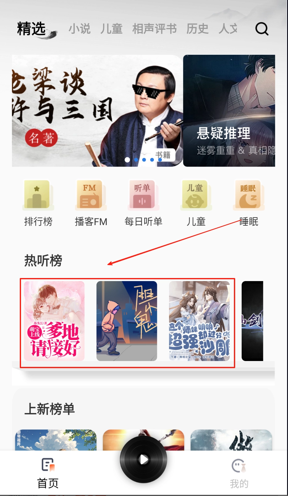 1、进入首页后浏览书籍的封面与简介,点击试听片段来判断是否符合自己的喜好。