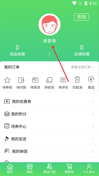 1、点击界面上的【未登录】区域,即可进入登录流程,在此过程中还能看到【商品收藏】【店铺收藏】等功能的入口。