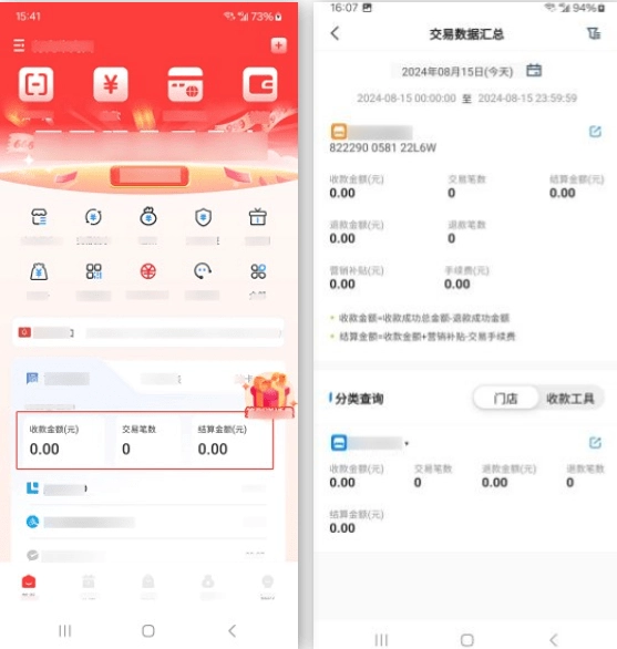 *可查看当日或通过筛选指定日期的收款金额、交易笔数、结算金额、退款金额、营销补贴(营销平台配置的活动)、退款笔数等汇总数据