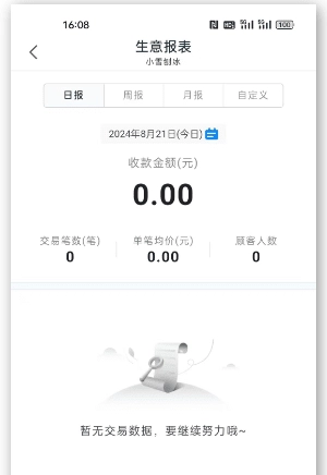 拉卡拉首页点击【生意报表】或【全部应用】【生意报表】可至此页面,支持查看按日、周、月或自定义时间范围内的交易汇总数据