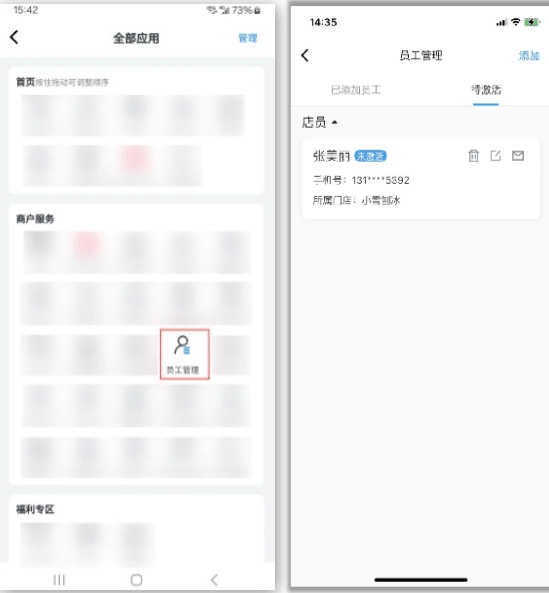 支持添加和查看店长和店员,新添加的角色需拉卡拉实名认证完成激活店长主要权限: