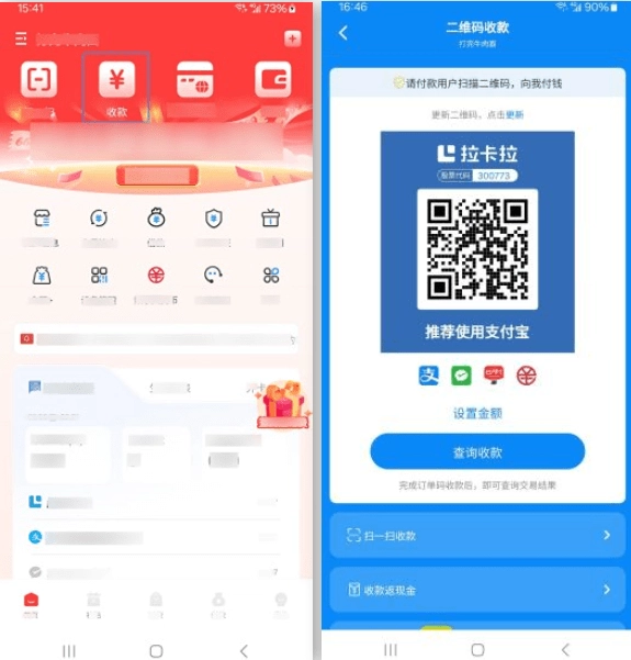 拉卡拉首页点击【收款】可至此页面,支持【扫一扫收款】和【二维码收款】