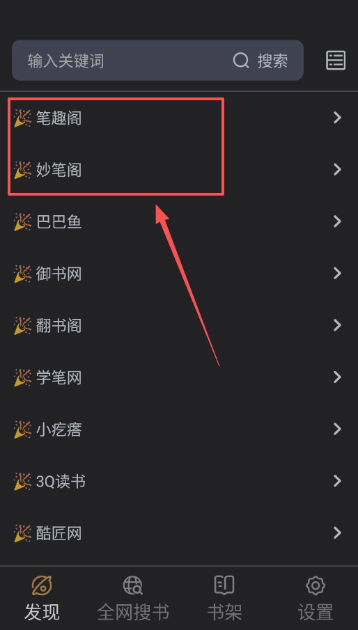 在发现页面输入书名或者作者的名字,就能从笔趣阁、妙笔阁这类书源网站搜索相关书籍,找到合适的书籍后添加到书架里就可以开始阅读了。