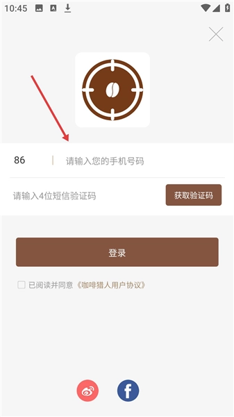 2、打开咖啡猎人应用,点击底部导航栏的“我的”选项,进入登录页面后,输入手机号码并获取验证码,完成登录操作就能开启咖啡探索之旅了。