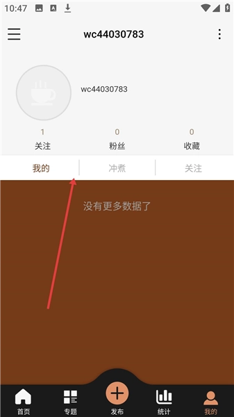 1、进入咖啡猎人的“我的”页面,你可以看到个人账号相关信息,像关注、粉丝以及收藏的数量都一目了然,同时还能切换到冲煮、关注等不同分类,去查看对应的内容。