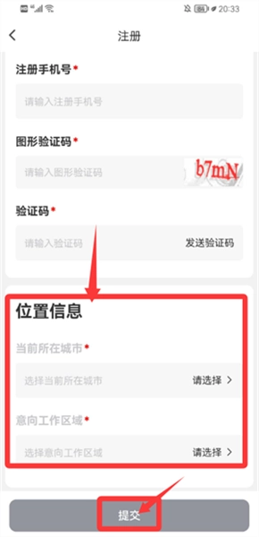 4、补充所在城市和工作区域的信息,点击提交按钮,即可完成注册流程。