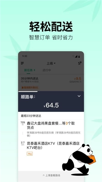 熊猫快送是一款专为配送骑手打造的服务类软件,它对接了美团、饿了么、京东到家、抖音等多个平台,能够实现订单的实时同步。骑手可以根据自己的需求进行订单筛选,比如选择价格优先或距离优先,也可以开启平台的智能派单功能。系统会依据实时路况规划最优配送路线,有效缩短配送时间,同时,对于新派订单或即将超时的订单,软件会通过语音播报及时提醒骑手。此外,骑手的收入情况可以实时查看,并且支持快速提现。