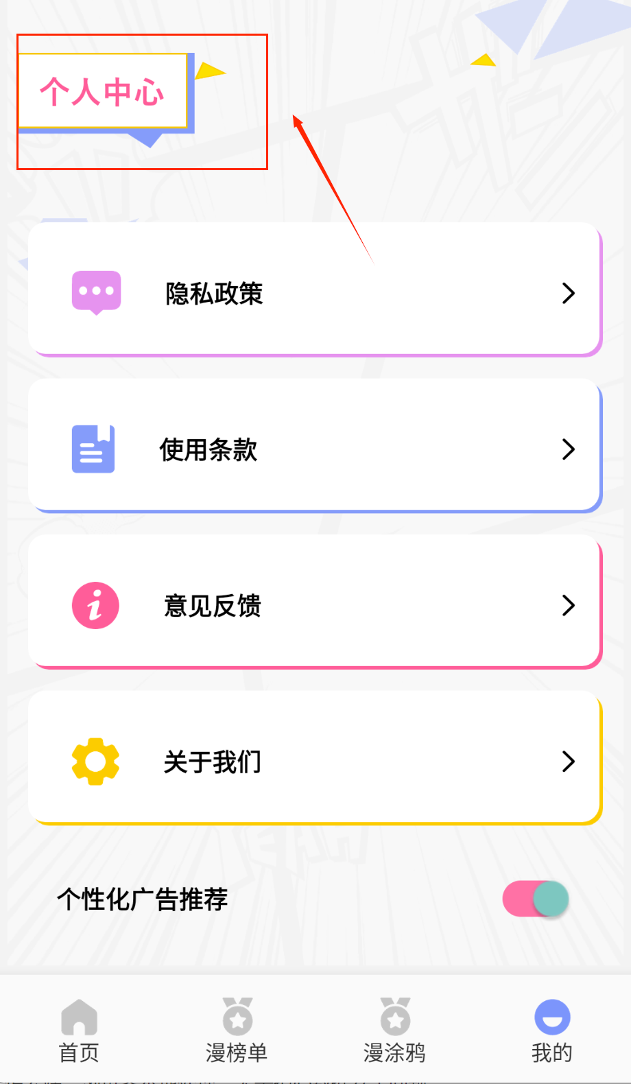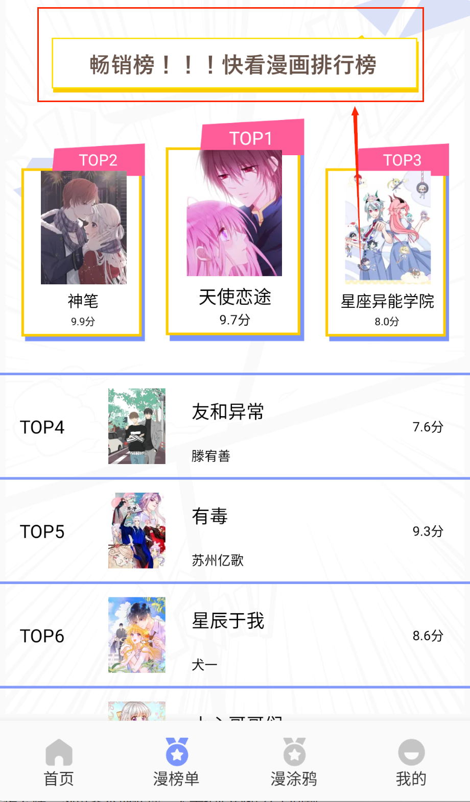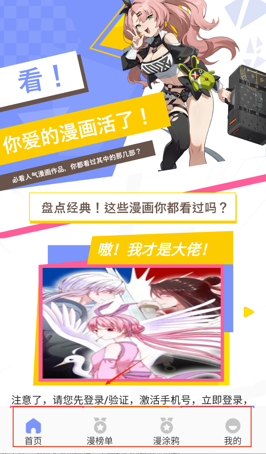 1、打开漫画软件后首先会看到底部导航栏,包含首页、漫榜单、漫涂鸦和我的四个主要功能区,新手建议从首页开始探索。