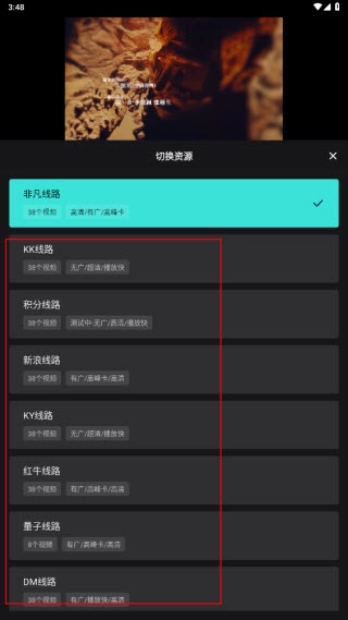 3、在这里我们可以选择其他线路,像KK线路、积分线路、新浪线路等,要是某部影视播放失败,不妨切换线路试试能不能解决问题。