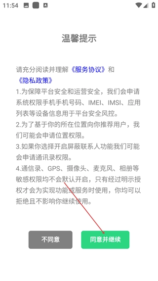 1、打开应用后,阅读《服务协议》和《隐私政策》,点击【同意并继续】按钮,完成协议确认进入应用。