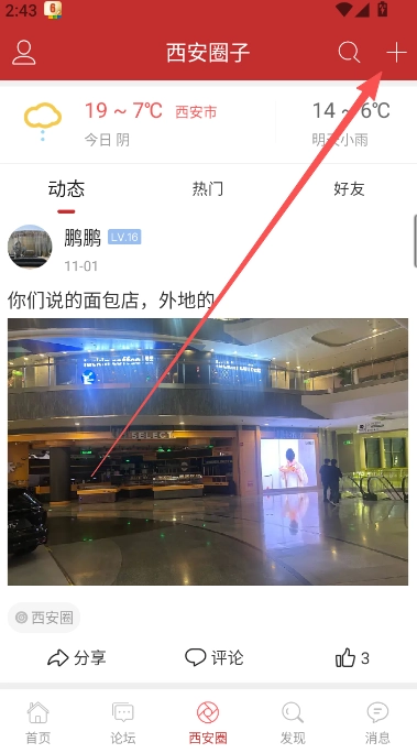 2、在西安圈版块点击右上方的+添加发帖申请。