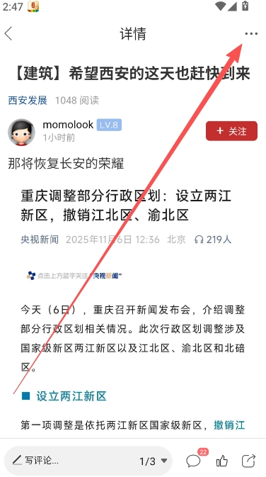 1、在悦西安平台发帖进行举报时,可点击对应帖子详情页面右上方的三点图标。