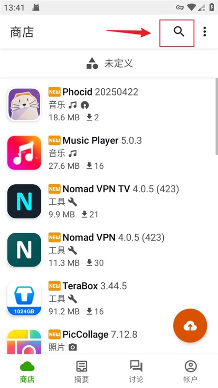 2、进入到Appteka主界面后,可以点击右上角的放大镜图标搜索自己想要的资源;