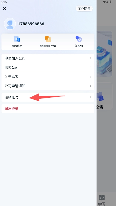 2、进入“工作职责”界面后,向下滚动页面找到“注销账号”选项。