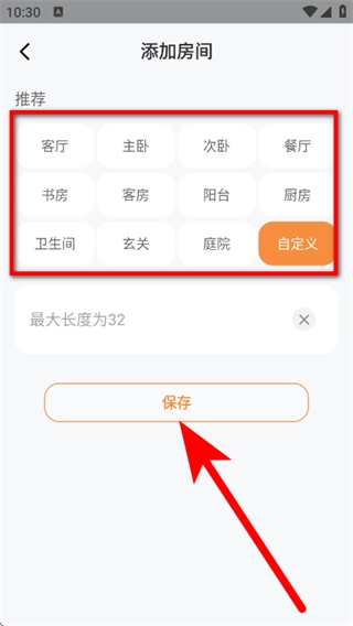 5、在添加房间页面,选择目标房间类型,点击保存,完成房间添加。