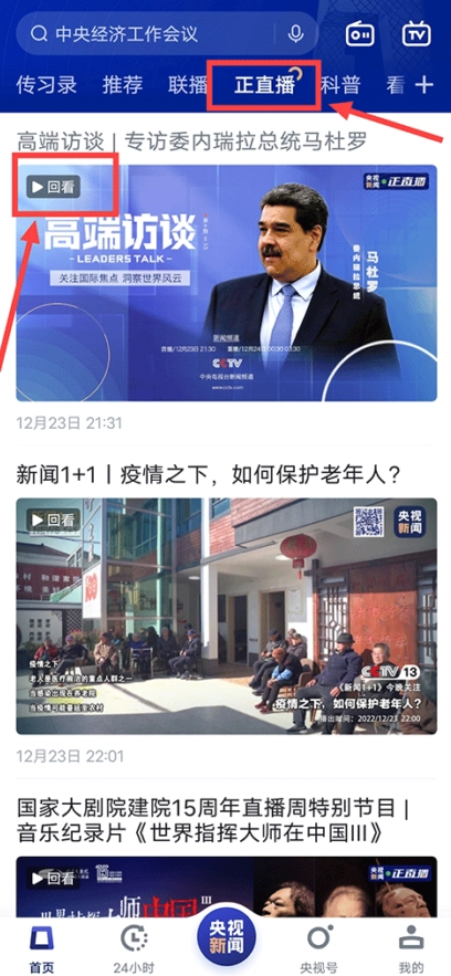首先我们需要打开软件,接着在首页顶部能看到【正直播】入口,进入直播界面后,会发现不少直播的左上角标注着“回看”状态,这里汇集了此前各类新闻直播的回放内容,点击相应直播即可进行回看。
