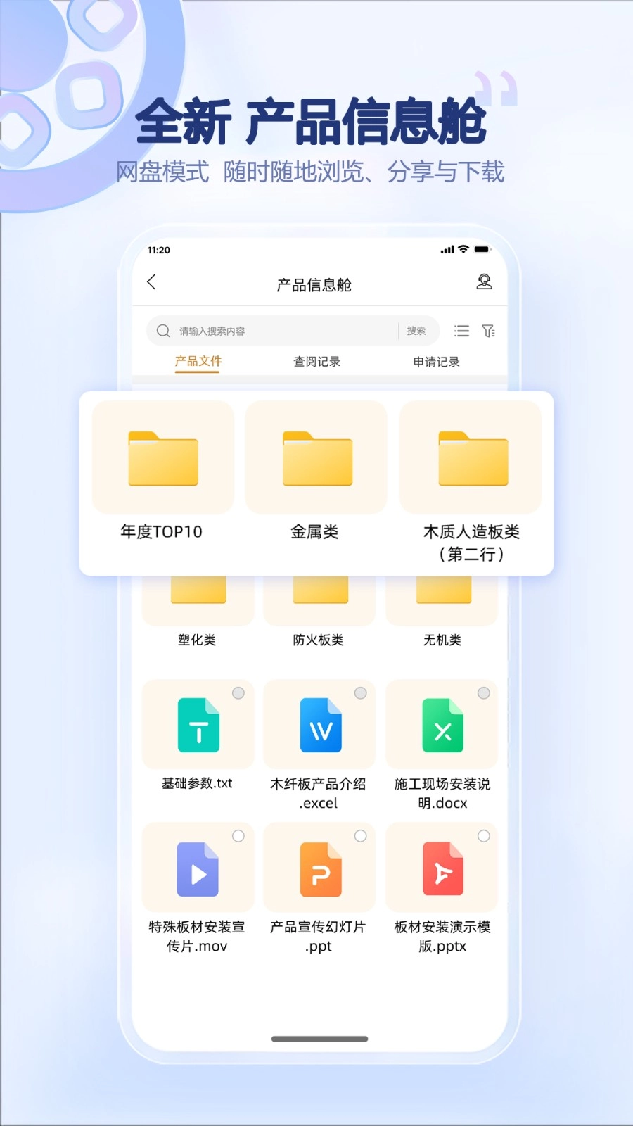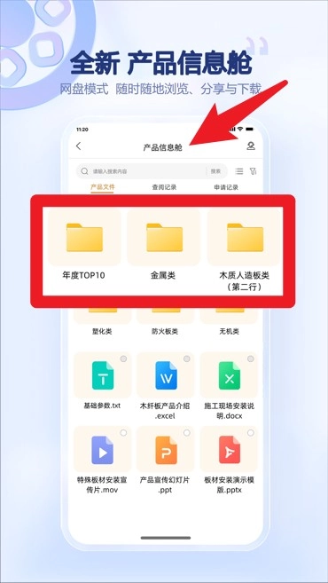 产品信息舱模块采用网盘形式呈现文件,可实现分类浏览、随时查看等功能,并支持资料管理。