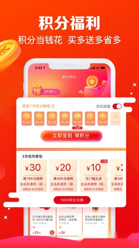 3、【积分抵现 多买多省】购物就能获得积分,消费满特定金额还能享受多倍积分福利,积分不仅可以直接抵扣现金,还能用来兑换优惠券。