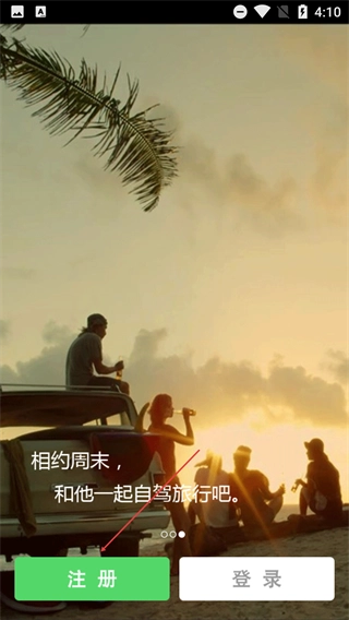 1、打开应用进入欢迎界面后,能点击【注册】按钮开启注册流程。这款应用主要提供自驾旅行相关服务,界面风格贴合休闲出行的场景氛围。