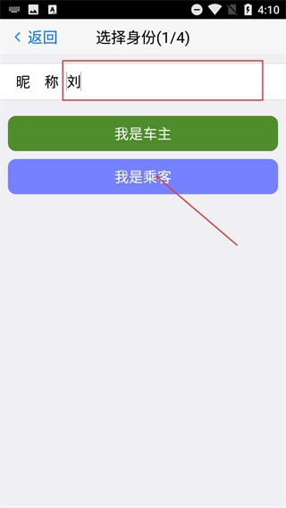2、进入“选择身份(1/4)”环节后,先填写昵称,再选择对应的身份选项(比如“我是车主”或者“我是乘客”),这样就完成了注册流程第一步的信息填写。