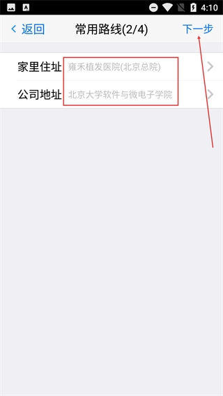3、进入“常用路线(2/4)”环节,填写家庭住址、公司地址等相关信息,确认无误后点击【下一步】,继续进行后续的注册流程。