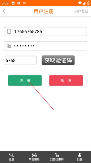 3、在用户注册页面,依次填写手机号、设置密码,获取并输入验证码,最后点击【注册】按钮,即可完成账号注册流程。
