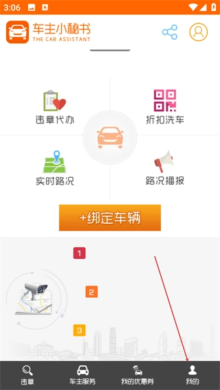 进入【车主小秘书】的主界面后,能看到【违章代办】【折扣洗车】等功能选项,接着点击页面底部的【我的】按钮,即可进入个人中心页面。