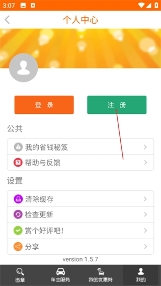 在个人中心页面,能看到【登录】【注册】按钮,以及【我的省钱秘笈】等功能入口,点击【注册】即可进入注册界面。