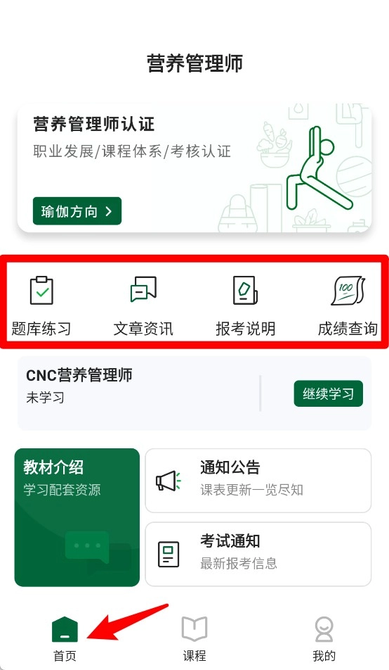 在首页找到题库练习、文章资讯、报考说明以及成绩查询等入口并点击,即可快速进入对应的功能页面。