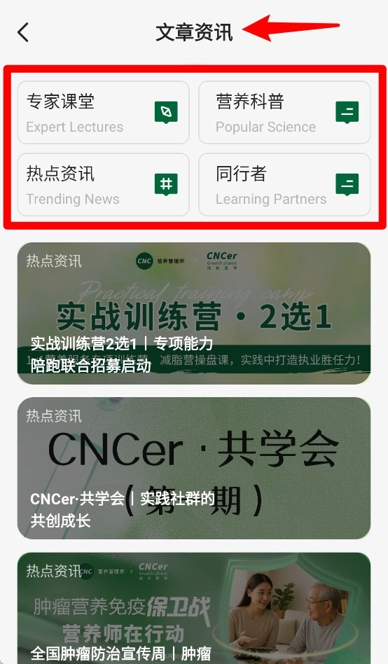 点击“文章资讯”,即可浏览专家课堂、营养科普、热点资讯以及同行者这四类精心筛选的内容。