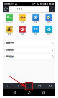 1、启动米侠浏览器,点击界面底部中间位置的【三横线】图标,具体可参照图示。
