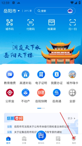 是岳阳市政府推出的智慧政务平台,整合党务、政务、民生等200+服务事项,打造"掌上政务大厅"。依托云计算与大数据技术,实现90项高频查询、40类在线办理功能,涵盖证照管理、医疗挂号、不动产登记等全场景需求。采用轻量化架构设计,支持电子签章、人脸识别等无纸化操作,市民足不出户即可完成水电气过户、新生儿登记等业务办理,日均处理民生事务超5000件,成为岳阳市民"指尖办事"的核心入口。1、打开应用在首页页面点击【我的】。
