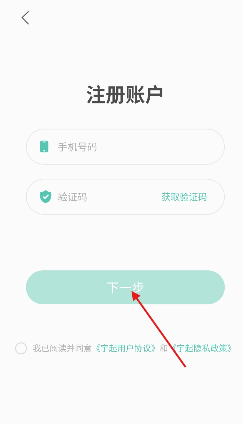 4 、这时会弹出注册信息填写框,准确输入个人手机号,获取验证码并填入,点击“下一步”,即可完成宇起账号的注册流程。