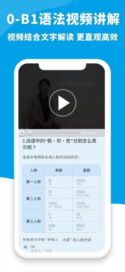 ◆ **0到B1阶段学习内容**:系统涵盖法语从基础到中级的知识体系,适配法语初学者及有进阶需求的学习者。学习内容包含核心词汇、语法要点、常用表达等模块,由资深教师团队匠心打造,助力您实现阶梯式稳步提升。教师团队提供专业的视频精讲,帮助您透彻掌握每个知识点;同时配套完整电子教材,方便您利用碎片化时间随时学习。