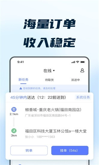 平台支持抢单功能,一旦发现优质订单,建议您果断抢单,同时我们也会协助解决订单配送环节中可能出现的各类问题。