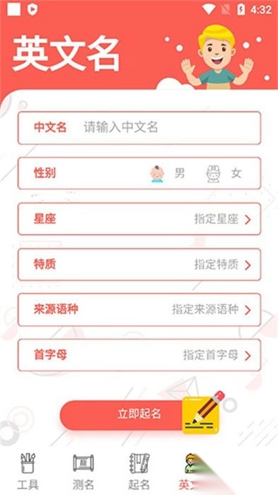 打开起名多多后,您会看到主页面被划分成工具、测名、起名、英文名和我的这五个主要版块。