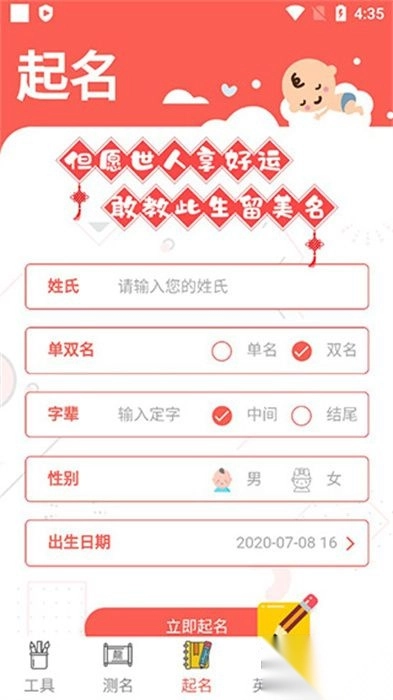 在“起名”板块,按顺序填写姓氏、单双名、字辈、性别和出生日期等信息,点击“立即起名”按钮,就能获取合适的名字推荐。