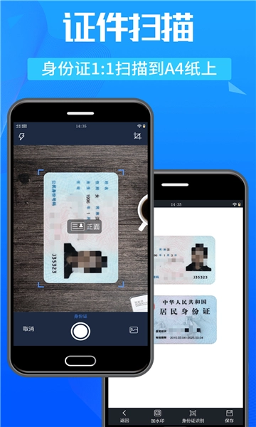 拍摄身份证时,系统会自动按1:1比例适配到A4纸张上,同时还支持用户自定义添加水印。