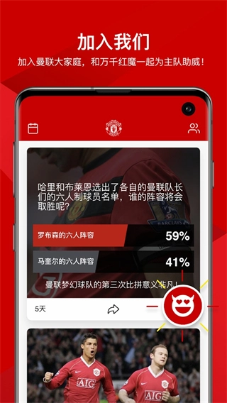 曼联是专为中国曼联球迷打造的资讯平台,24小时不间断推送独家新闻、球员教练幕后花絮及海量赛事内容,涵盖转会动态、训练日常、赛事追踪、互动投票与球迷福利,无论身处何地,都能第一时间掌握红魔全维度动态,拉近与球队的距离。